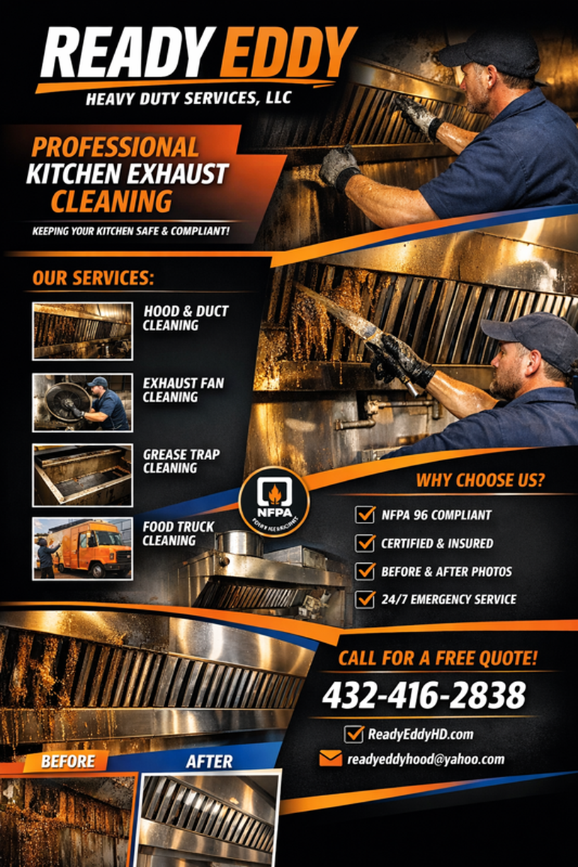Ready Eddy Heavy Duty Services is a trusted exhaust cleaning company based in Manvel, TX, delivering specialized solutions backed by 16 years of hands-on industry experience. Established in 2018, they bring a strong foundation in safety, compliance, and environmental awareness to every project. Their team holds NFPA 96 certification and is trained in OSHA 1910 confined space standards, ensuring each hood cleaning and kitchen exhaust cleaning service meets strict safety and fire prevention requirements. With an educational background that includes a health minor from the University of Houston, they approach every job with a clear understanding of sanitation, air quality, and risk reduction. Their process includes using a biodegradable degreaser to remove grease buildup while maintaining environmentally responsible practices.